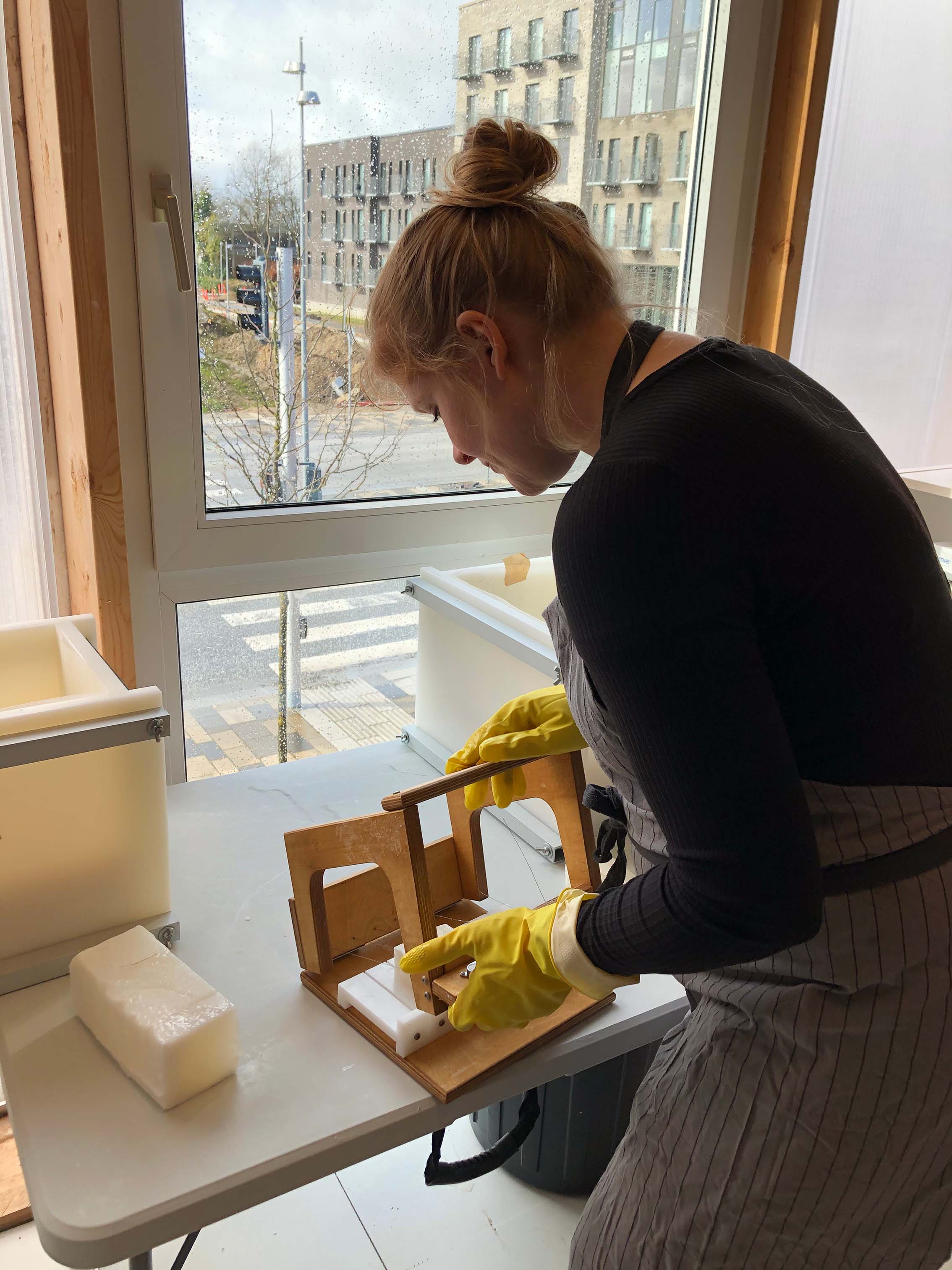 Vi besøgte Amalies værksted og prøvede kræfter med at lave sæbe - naturligvis godt pakket ind i sikkerhedsudstyr. Som I kan se, fik vi både skåret og stemplet pletfjernere, men vi tror dog, det er en god ting, at det er Amalie, der normalt står for dén del, for det er helt ikke så let, som det ser ud.